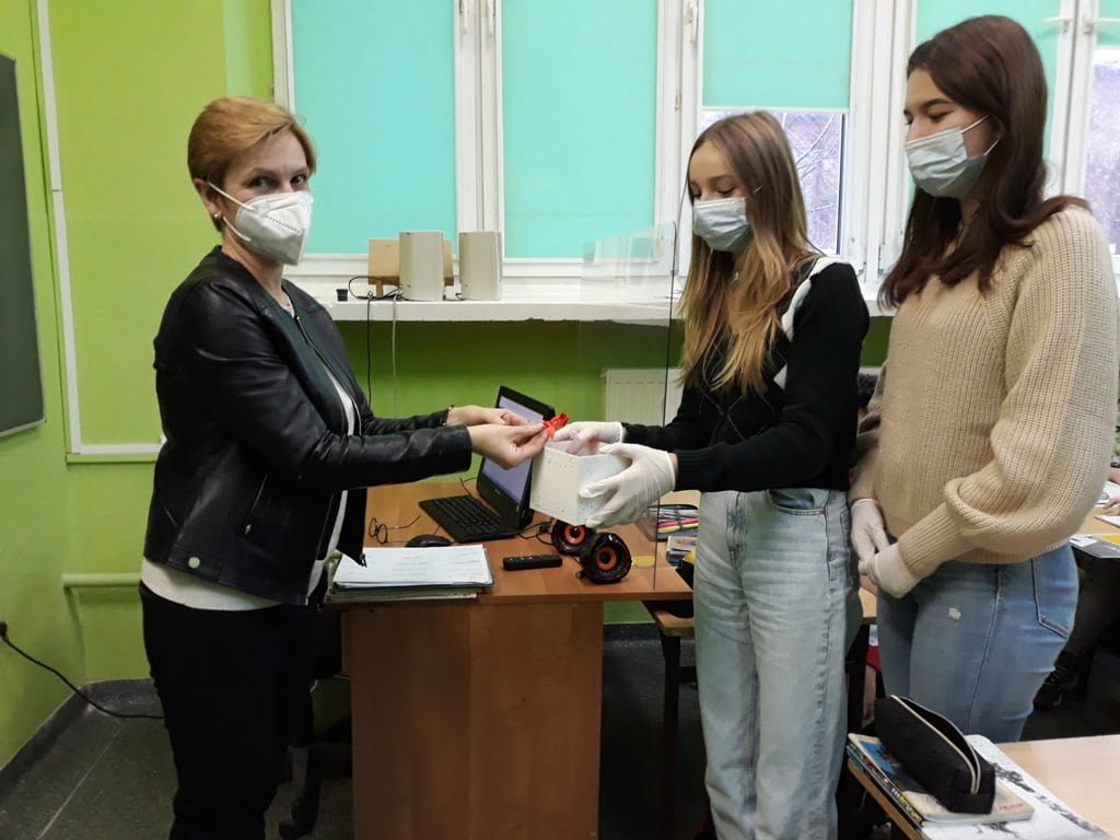 Nauczycielka i uczennice z robotem w klasie, wszyscy w maskach