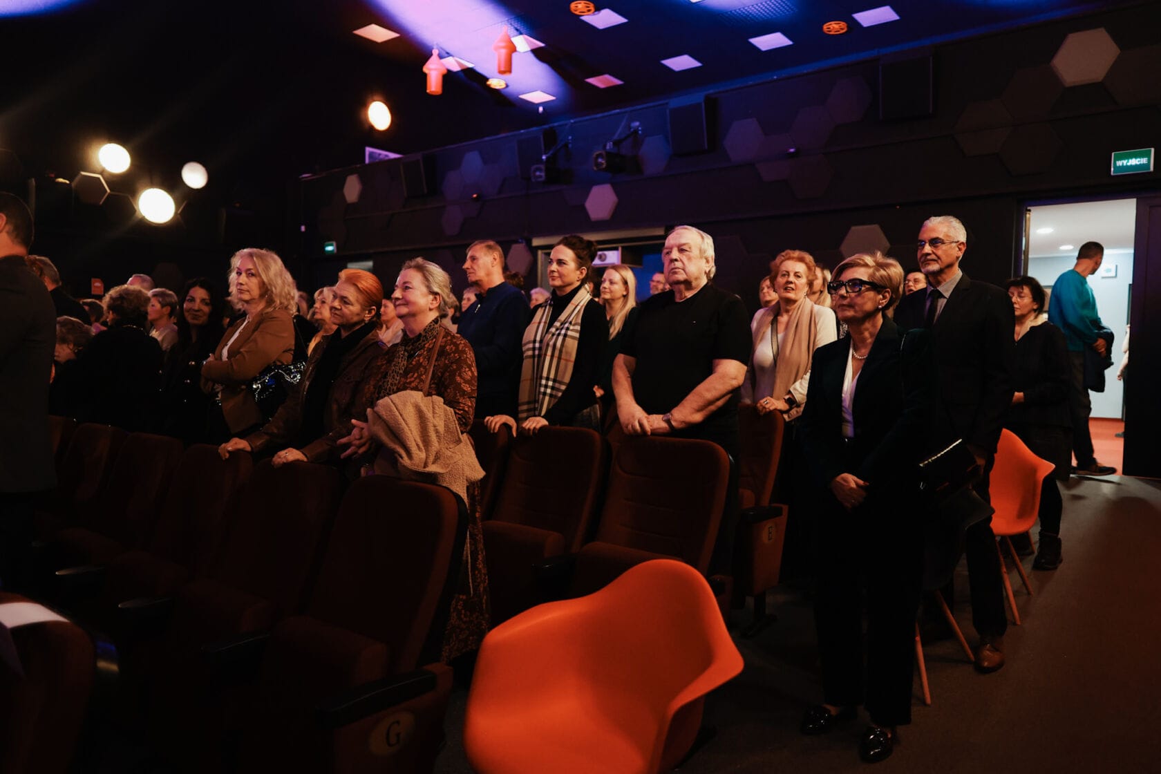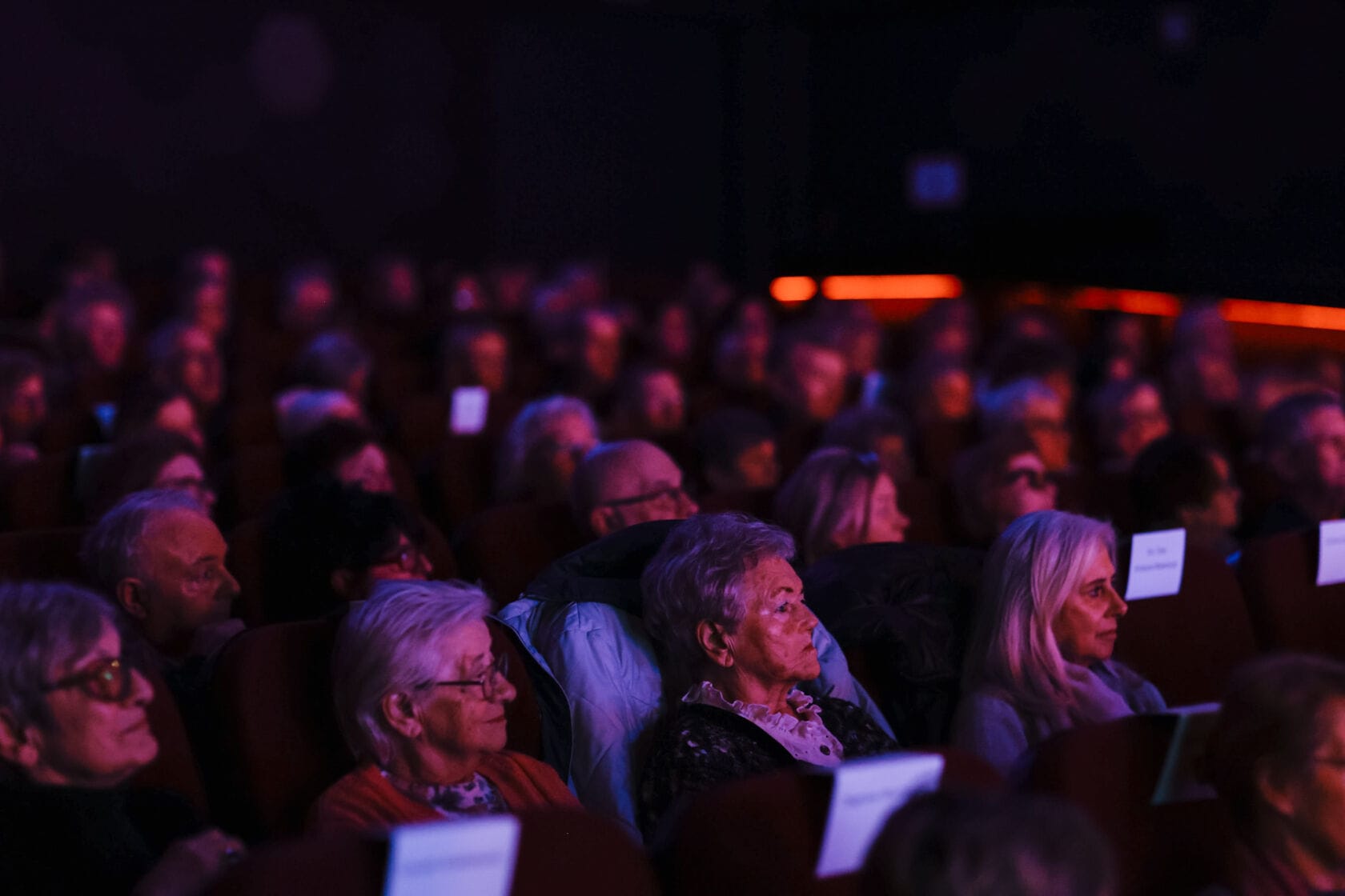 Grupa osób ogląda wydarzenie w zaciemnionej sali