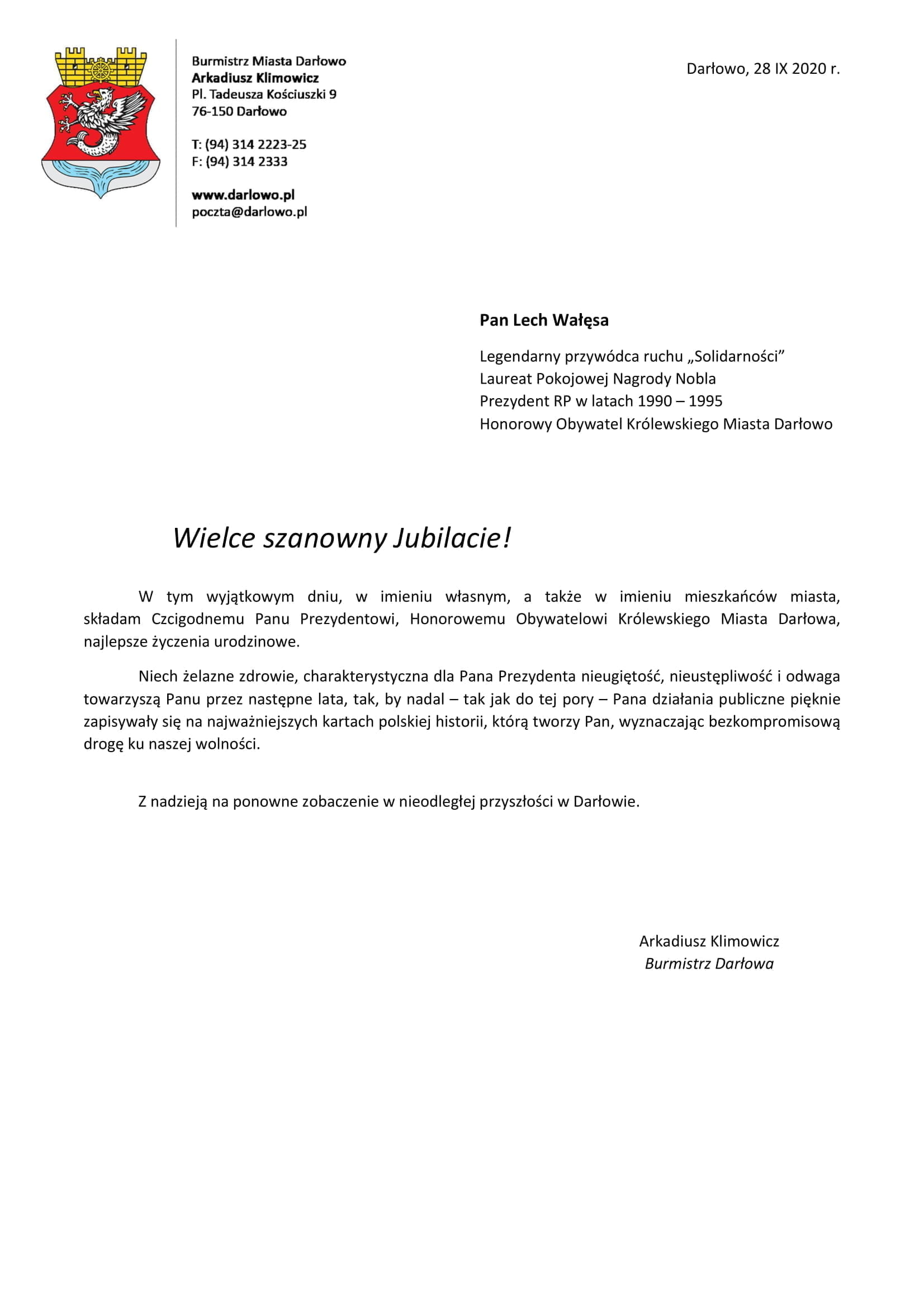 Z tej okazji Arkadiusz Klimowicz – Burmistrz Miasta Darłowo przesłał Jubilatowi okolicznościowe życzenia.