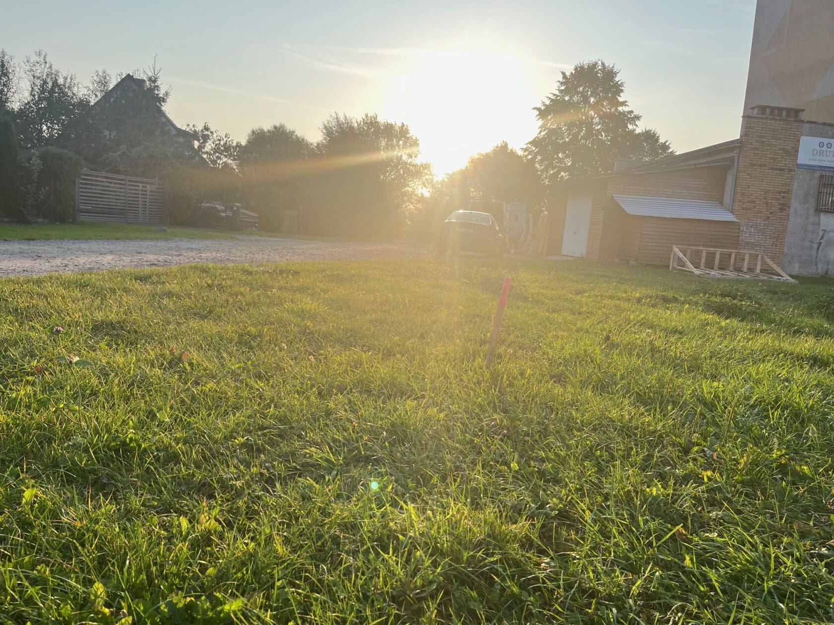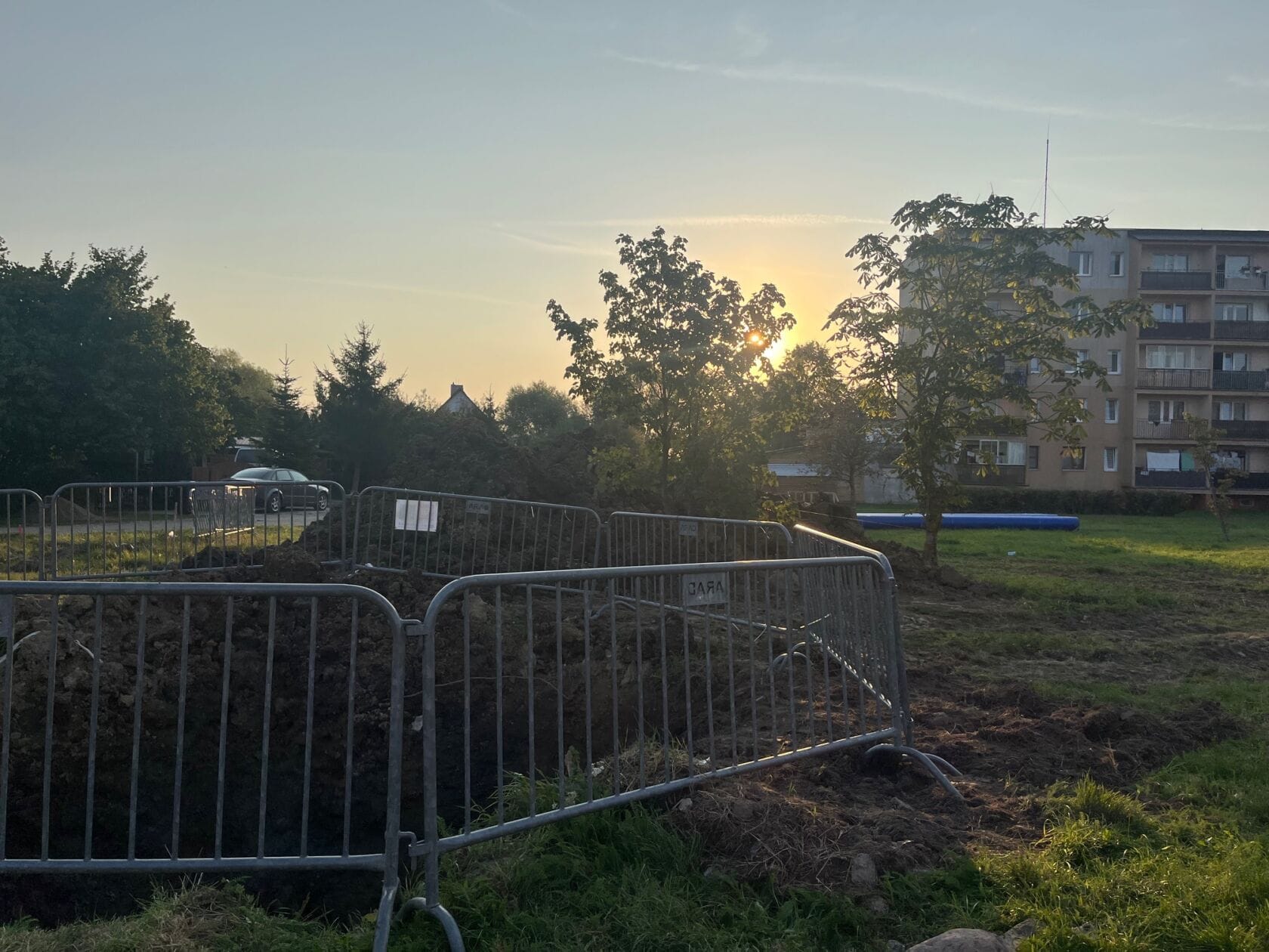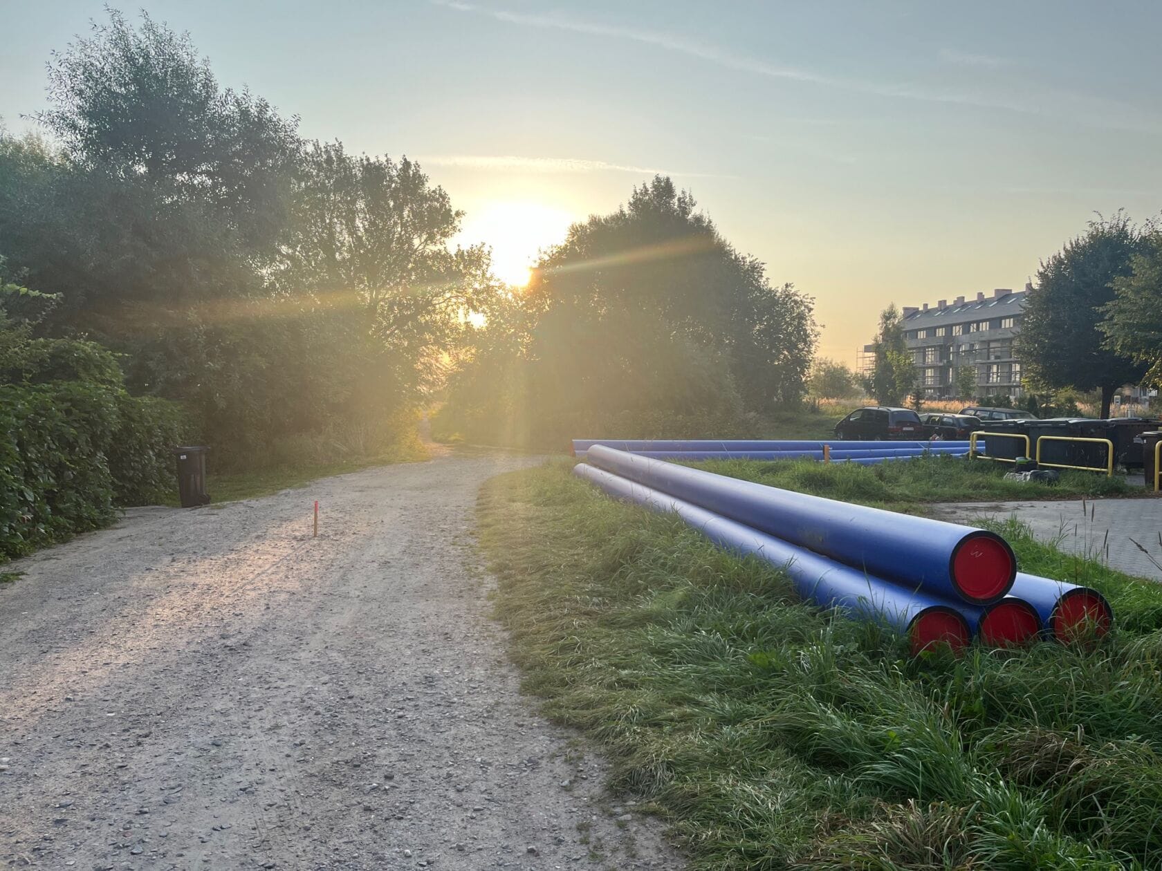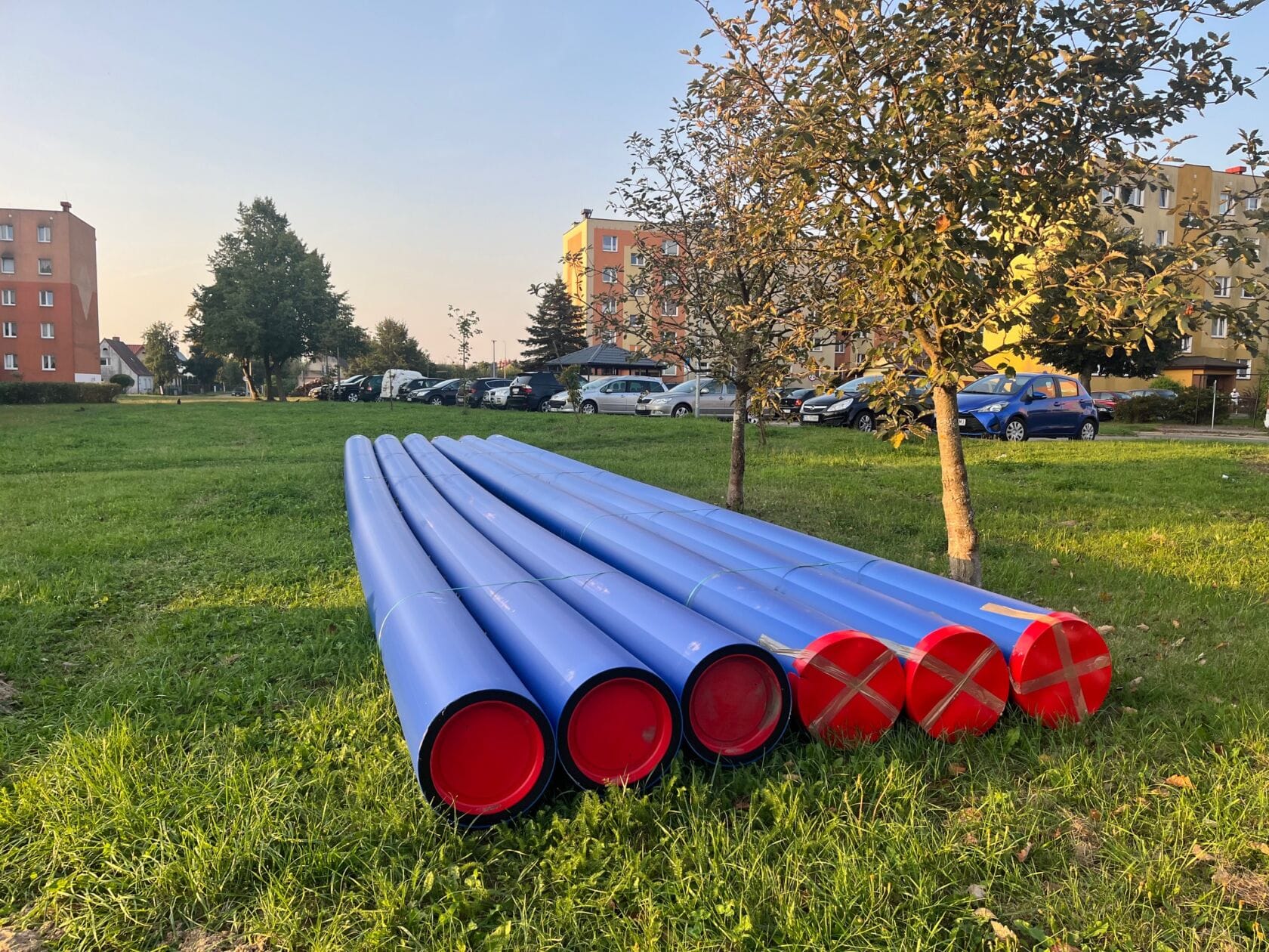 Niebieskie rury na trawie przy osiedlu wczesnym rankiem