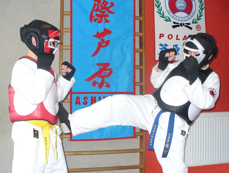 Dwaj zawodnicy Ashihara Karate w pełnym sprzęcie treningowym