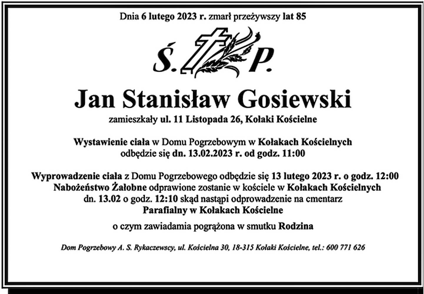 Pogrzeb Jana Gosiewskiego odbędzie się w poniedziałek, 13.02.2023 r w Kołakach Kościelnych w województwie podlaskim w powiecie zambrowskim. Wystawienie ciała o godz. 11:00 w Domu Pogrzebowym w Kołakach Kościelnych. Tego samego dnia o godzinie 12:10 odprawione zostanie nabożeństwo żałobne w kościele pw. Wniebowzięcia Najświętszej Maryi Panny w Kołakach Kościelnych, skąd nastąpi odprowadzenie na cmentarz parafialny.