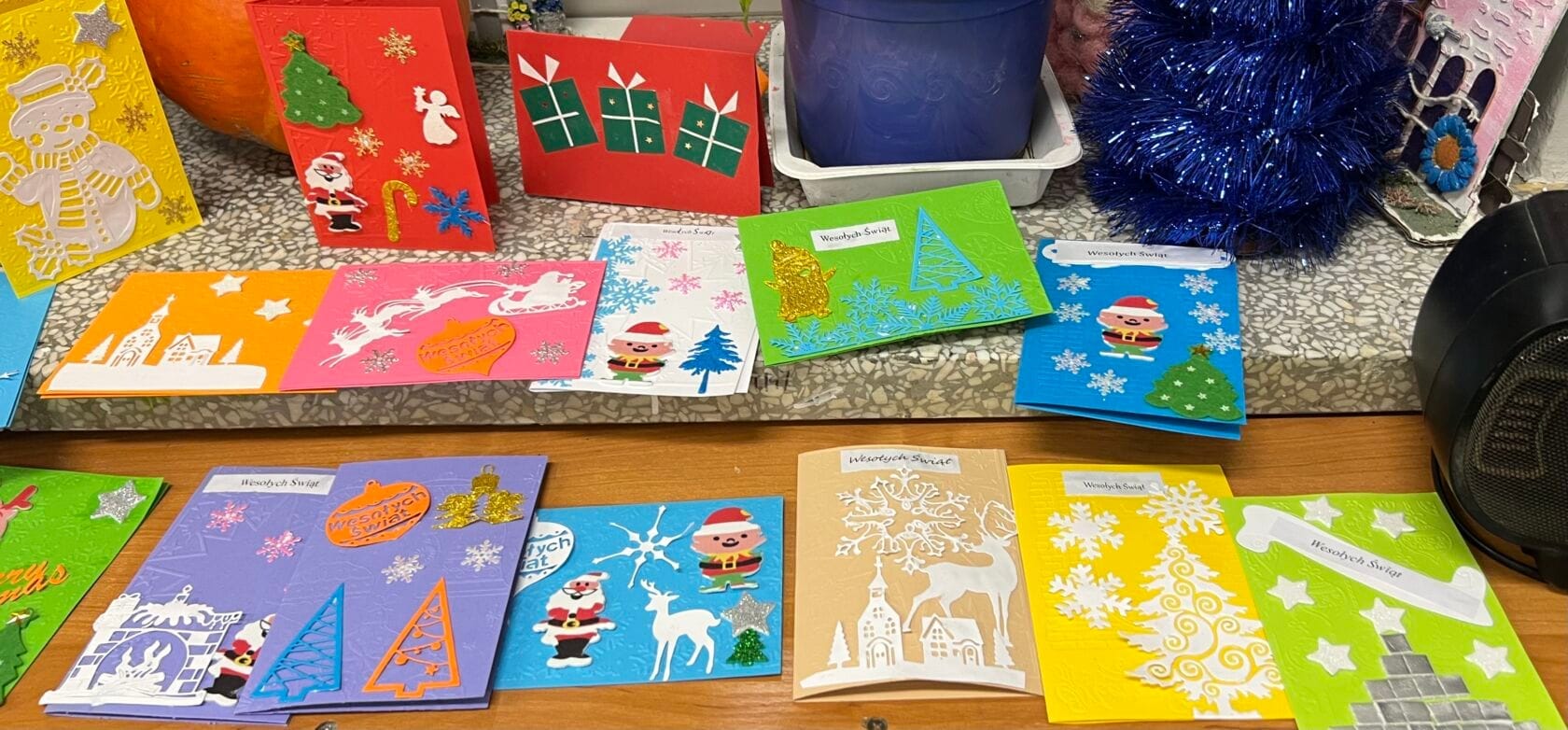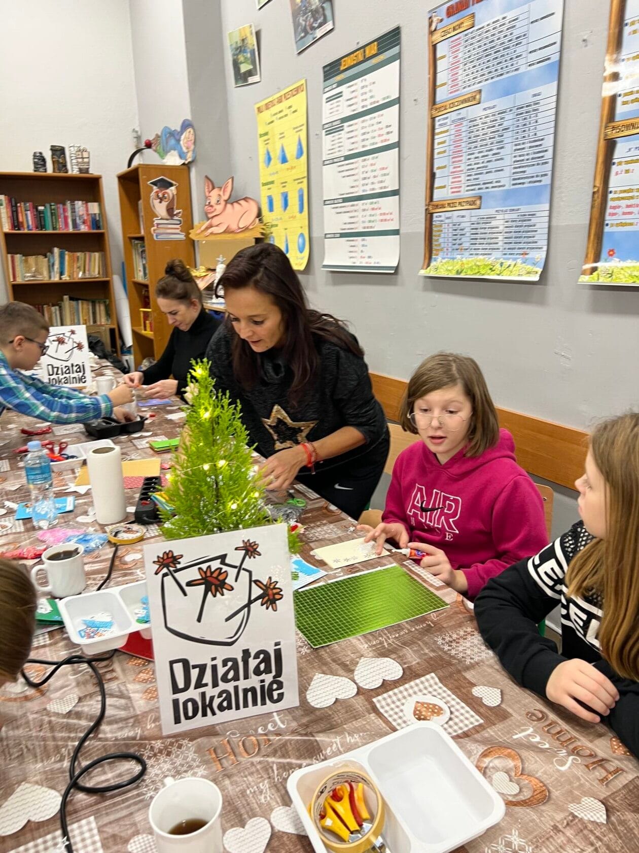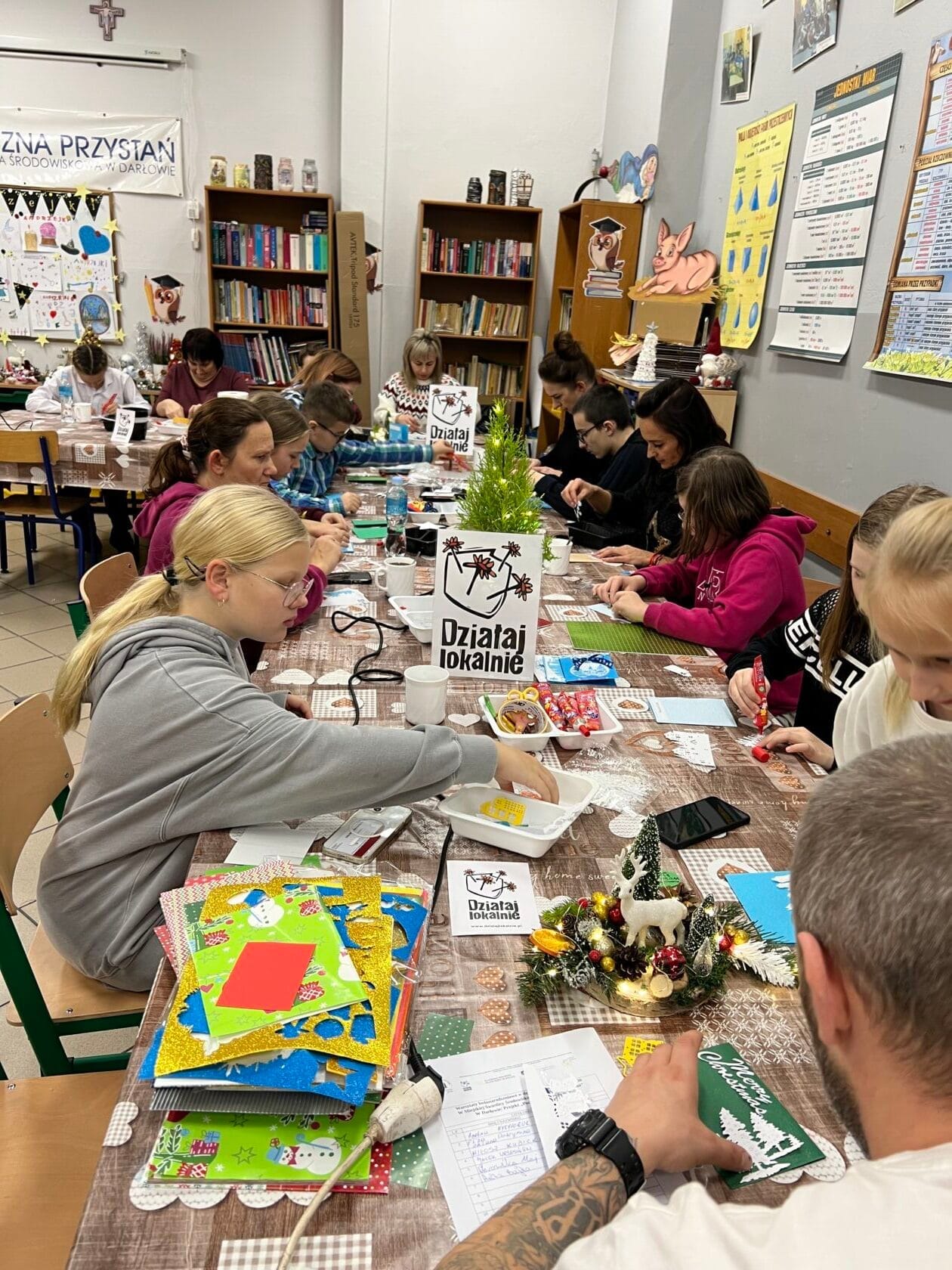 Podczas warsztatów uczestnicy mieli okazję wspólnie przygotowywać kartki świąteczne oraz piękne stroiki. Prace wykonane przez dzieci i dorosłych zachwycały swoją kreatywnością i starannością. Z każdej kartki i stroika emanował prawdziwy duch świąt, a przygotowywanie ich było doskonałą okazją do wspólnej zabawy i twórczej pracy.