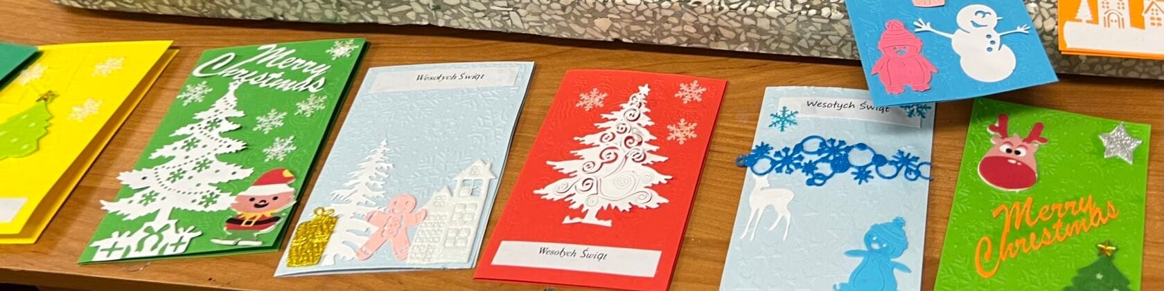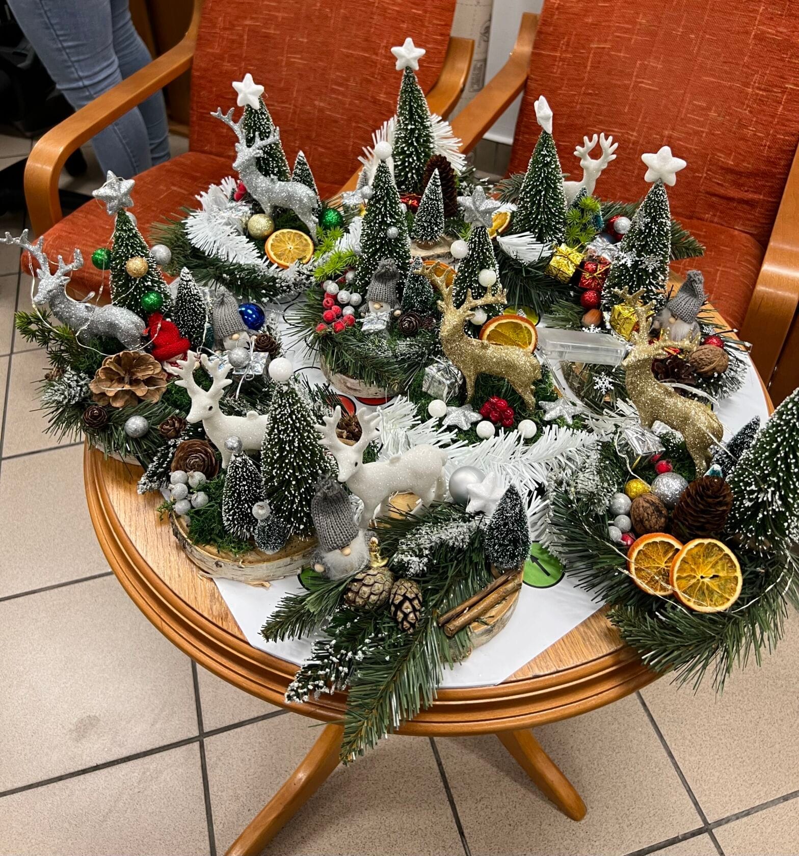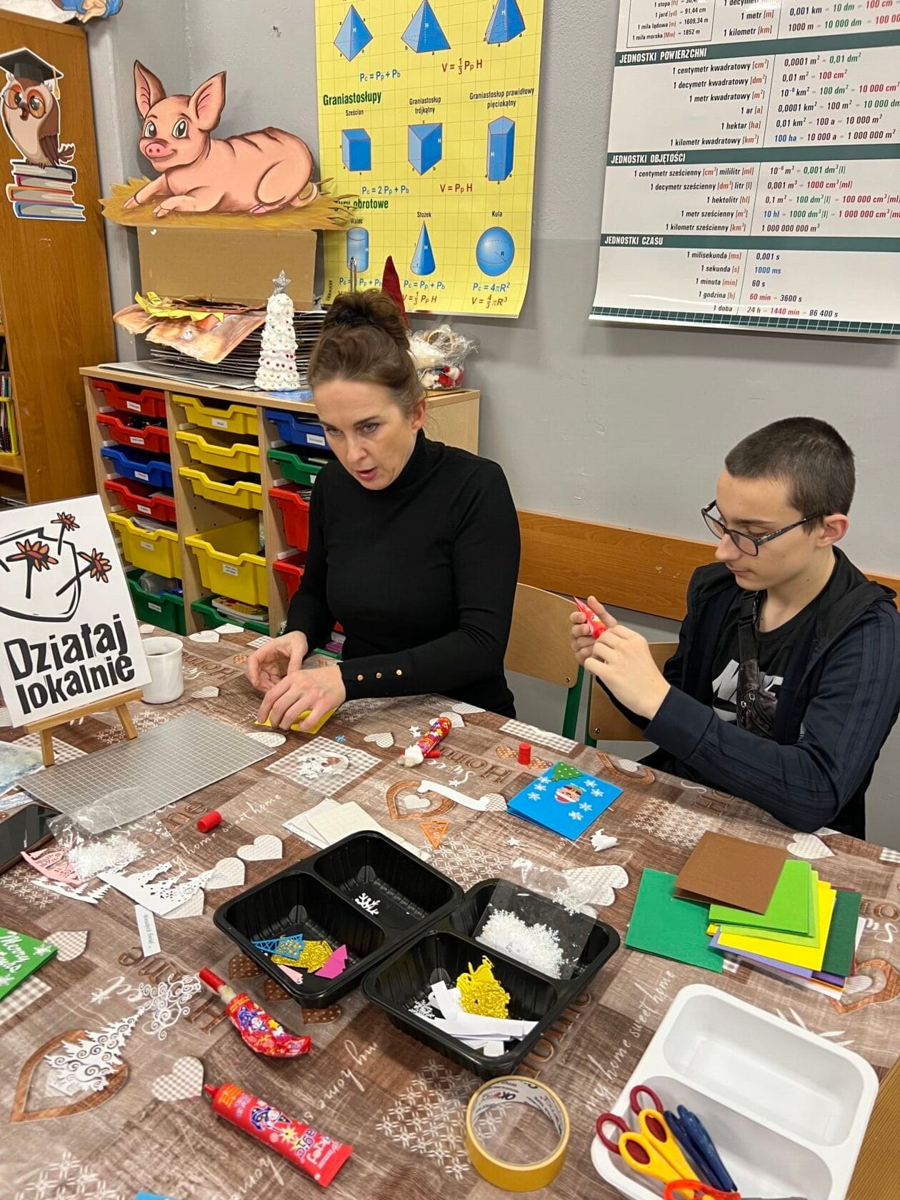 Podczas warsztatów uczestnicy mieli okazję wspólnie przygotowywać kartki świąteczne oraz piękne stroiki. Prace wykonane przez dzieci i dorosłych zachwycały swoją kreatywnością i starannością. Z każdej kartki i stroika emanował prawdziwy duch świąt, a przygotowywanie ich było doskonałą okazją do wspólnej zabawy i twórczej pracy.