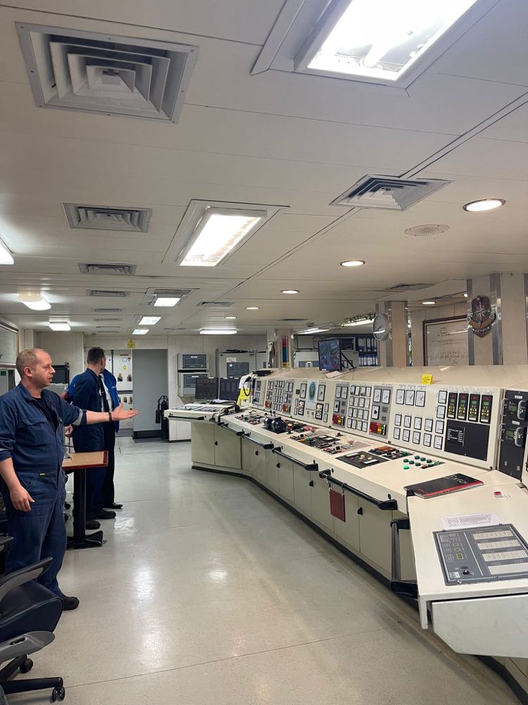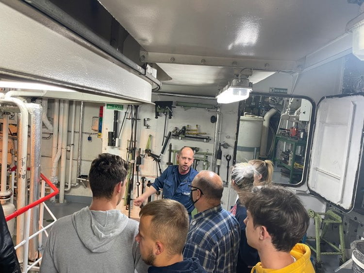 Bardzo ciekawą i niezapomnianą częścią wyjazdu był rejs edukacyjny promem Mazovia. Za zgodą kapitana promu zobaczyliśmy pracę załogi „od kuchni” – wchodząc na mostek kapitański, poznając kajuty o różnych standardach oraz schodząc pod pokład do samego serca maszyny.