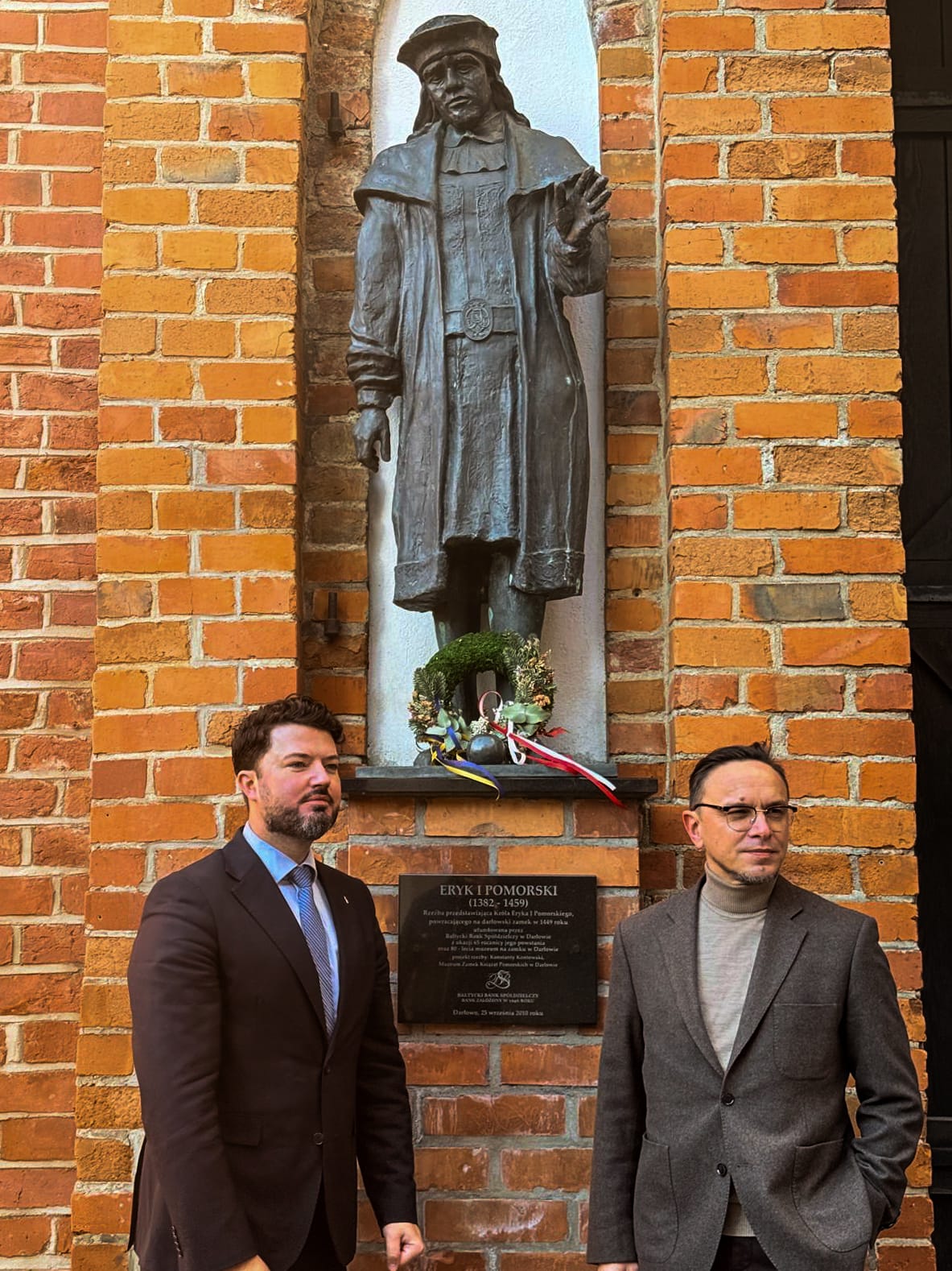 Gości przyjął zastępca burmistrza Darłowa Krzysztof Walków. Ze względu na trwające prace renowacyjne w krypcie kościoła Mariackiego, gdzie spoczywa Król Eryk Pomorski, symboliczny akt złożenia kwiatów odbył się przy jego pomniku na dziedzińcu Zamku Książąt Pomorskich. To tam – w miejscu najbardziej nasyconym jego legendą – oddano hołd władcy, który przez wieki był łącznikiem między Darłowem a Skandynawią.