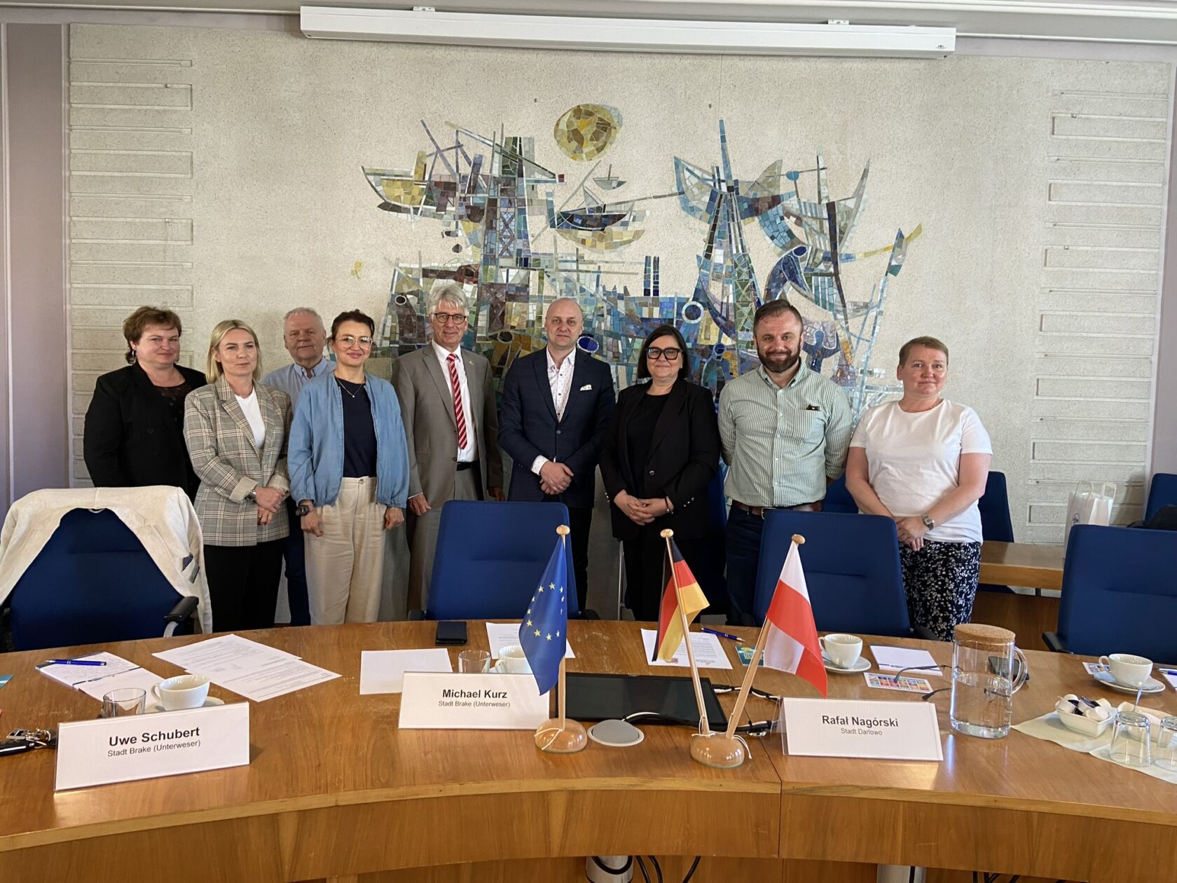 W dniach 15-18 maja 2024 roku oficjalna delegacja z Darłowa odwiedziła swoje partnerskie miasto Brake (Unterweser) w Niemczech. Głównym celem wizyty było ustalenie harmonogramu wspólnych działań na najbliższe miesiące, tak, by jak najlepiej dzielić się wzajemnymi doświadczeniami w zarządzaniu miastem. W skład darłowskiej delegacji weszli: Rafał Nagórski – zastępca burmistrza Darłowa, Artur Wejnerowski – kierownik Biura Promocji Miasta i Komunikacji Społecznej, Agnieszka Graczyk – kierownik referatu Gospodarki Odpadami, Anna Tyrańska – kierownik Biura Rady Miejskiej, Barbara Kaczyńska – zastępca kierownika referatu oświaty i spraw społecznych, Agnieszka Schlegel-Chmielnicka – nauczyciel języka niemieckiego, hiszpańskiego oraz tłumacz z Zespołu Szkół Morskich w Darłowie. Za logistykę odpowiadał Robert Wójcik.