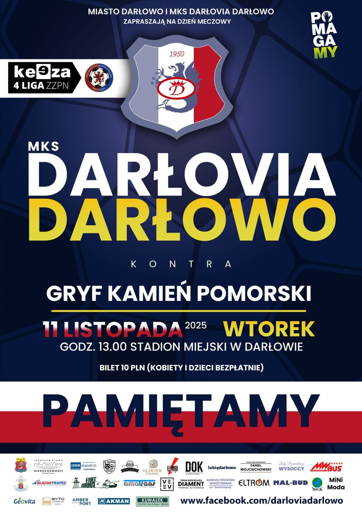 Darłovia Darłowo – Gryf Kamień Pomorski 11 listopada, godz. 15:00 – Stadion Miejski w Darłowie, ul. Sportowa 1 |