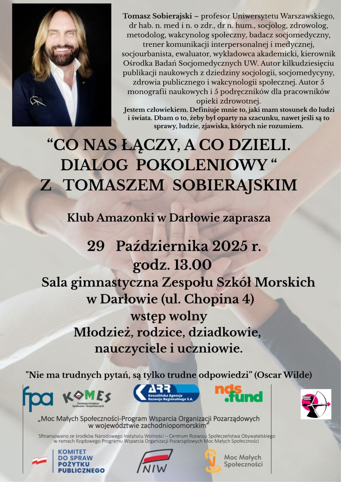 Klub Amazonki w Darłowie zaprasza na spotkanie z Tomaszem Sobierajskim – profesorem Uniwersytetu Warszawskiego, socjologiem, badaczem i autorem wielu publikacji naukowych. Rozmowa będzie dotyczyć relacji między pokoleniami, wzajemnego zrozumienia i sposobów budowania mostów między młodymi a starszymi. Na spotkanie zapraszamy młodzież, rodziców, dziadków, nauczycieli i uczniów – wszystkich, którzy chcą porozmawiać o tym, co nas […]