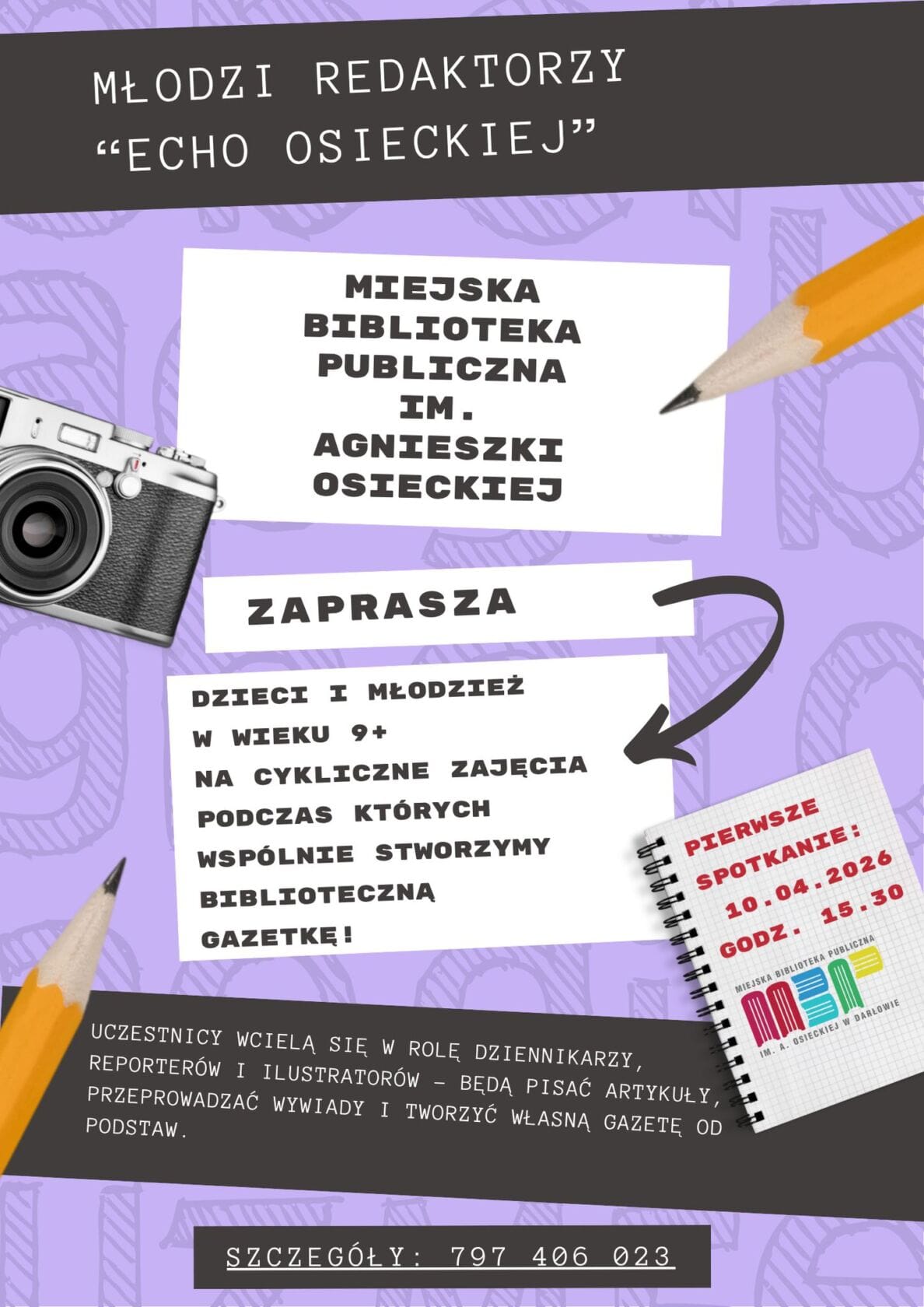 Zapraszamy dzieci i młodzież w wieku 9+ do udziału w cyklicznych zajęciach, podczas których wspólnie stworzymy gazetkę „Echo Osieckiej”