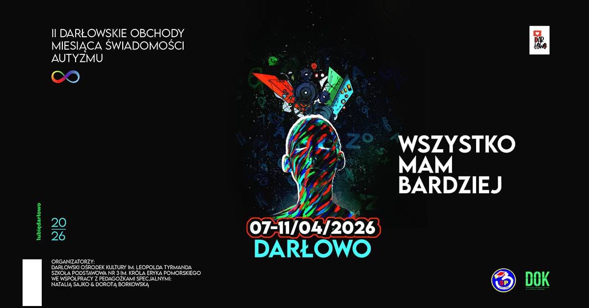 Darłowski Ośrodek Kultury im. Leopolda Tyrmanda oraz Szkoła Podstawowa nr 3 im. Króla Eryka Pomorskiego w Darłowie mają przyjemność zaprosić do udziału w wydarzeniu, które ma na celu zwiększenie świadomości społecznej na temat spektrum autyzmu i ADHD, ze szczególnym uwzględnieniem doświadczeń dziewcząt i kobiet. Dodatkowo pragniemy przybliżyć temat wybiórczości pokarmowej, często towarzyszącej osobom neuroróżnorodnym, a także promować akceptację, empatię i wrażliwość społeczną poprzez literaturę. W tegorocznym programie wydarzeń znalazły się m.in.: spektakl Bałtyckiego Teatru Dramatycznego w Koszalinie pt.: „Żeby umarło przede mną”, który zostanie pokazany w formie retransmisji już 7 kwietnia 2026 roku o godz. 17:00 w kameralnej przestrzeni LOLO kina Bajka. Spotkanie to zostanie rozbudowane i poszerzone o rozmowę z jedną z aktorek – Beatą Niedzielą. Ten głęboki spektakl oparty został na reportażu Jacka Hołuba pod tym samym tytułem. Z Jackiem Hołubem będziemy mieli okazję spotkać się dzień później, 8 kwietnia 2026 roku w Galerii SKŁO44. Ponadto gośćmi tegorocznej edycji będą: Agnieszka Rajs-Glazar (terapeutka dzieci ze spektrum autyzmu i wybiórczości pokarmowej), Agnieszka Paterak (samorzeczniczka spektrum autyzmu i ADHD Neuroatypową) i Alicja Bazan (kobieta z ADHD). Na zakończenie zaprosimy mamy dzieci neuroróżnorodnych do wspólnego stołu rozmów przy kawie. Tu będzie czas na wymianę doświadczeń, poznanie siebie i potrzeb tak różnych, jak cała gama kolorów w rozbudowanej palecie barw.