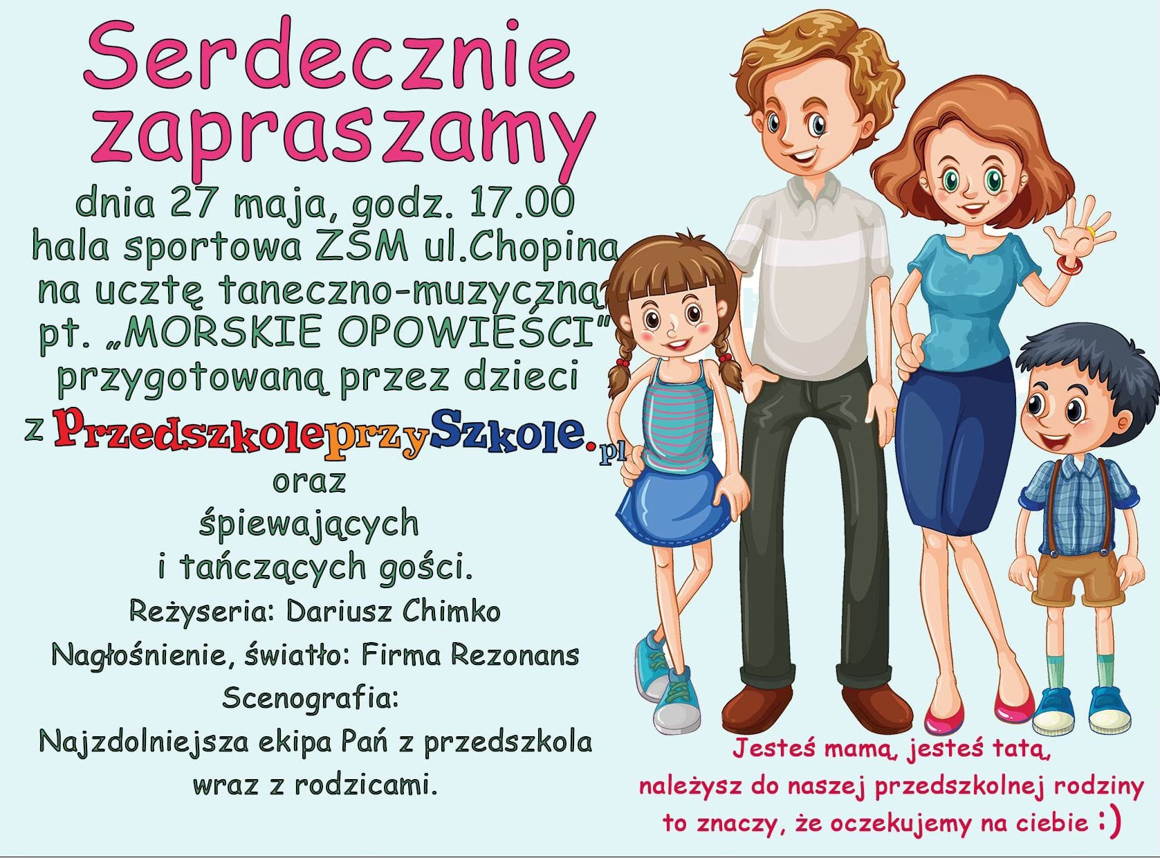 Przedszkole przy Szkole zaprasza wszystkie mamy, tatusiów, dziadków, sąsiadów i przyjaciół na wyjątkowe widowisko artystyczne pt. „Morskie opowieści”, przygotowane przez dzieci, kadrę przedszkola oraz śpiewających i tańczących gości specjalnych.