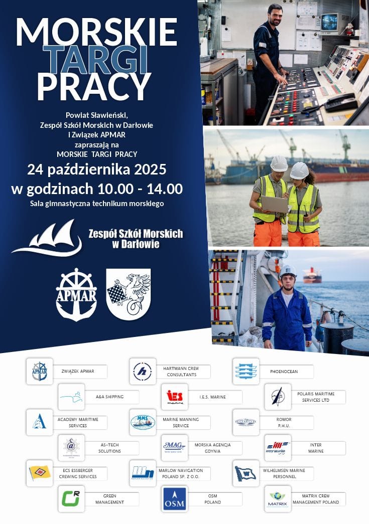 24 października Zespół Szkół Morskich w Darłowie zaprasza na “Morskie Targi Pracy.”. Na terenie szkoły zaprezentuje się 15 firm z branży morskiej. Uczniowie, nauczyciele, przedstawiciele rodziców, a także zainteresowani mieszkańcy powiatu sławieńskiego będą mogli zapoznać się z ofertami zatrudnienia i perspektywami zawodowymi. Prócz stanowisk wystawowych w świetlicy internatu odbędą się wykłady “Przybliżenie rynku pracy branży morskiej”, “Ścieżki Kariery na Morzu”. Branża morska oferuje szerokie perspektywy zawodowe, od pracy na statkach (marynarz, kapitan, oficer mechanik) po stanowiska związane z rozwojem morskiej energetyki wiatrowej (inżynier wiatrowy, technik konserwacji). Rozwój sektora offshore tworzy liczne miejsca pracy, a także istnieją możliwości w branży turystycznej (obsługa na statkach wycieczkowych). Zapraszamy bardzo serdecznie zainteresowanych rozwojem ukierunkowanym na morze!