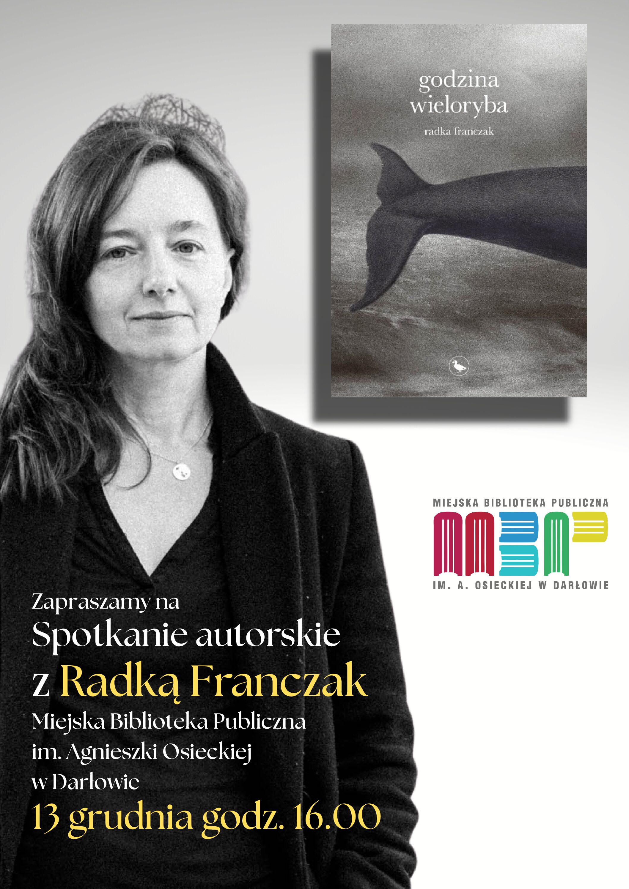 Miejska Biblioteka Publiczna w Darłowie zaprasza na spotkanie autorskie z Radką Franczak, autorką poruszających, poetyckich powieści, która zaprasza w podróż do świata „Godziny wielorybów” – historii o kobiecie podążającej za tajemniczym zewem natury i własnego serca.
