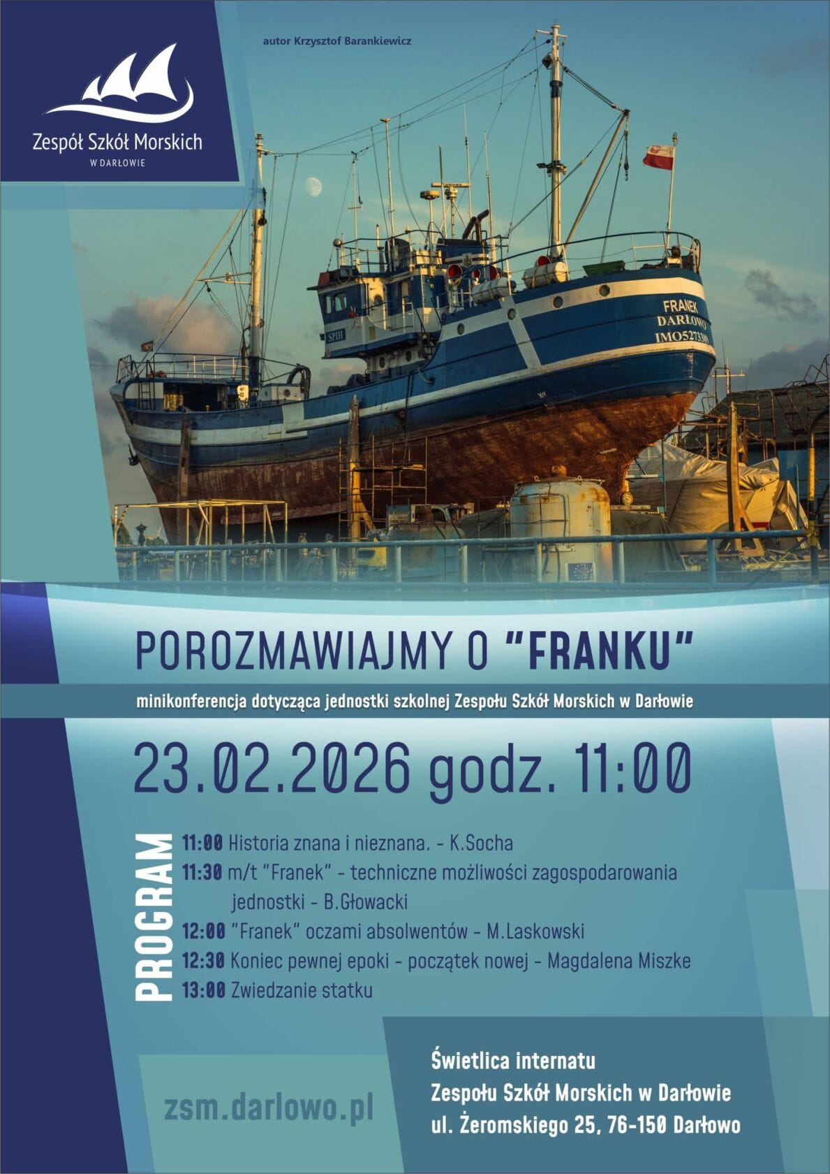 Organizatorzy zapraszają wszystkich zainteresowanych — absolwentów, uczniów, pracowników szkoły oraz sympatyków morza — do wspólnej rozmowy i refleksji nad rolą, jaką m/t „Franek” odegrał w historii szkoły.