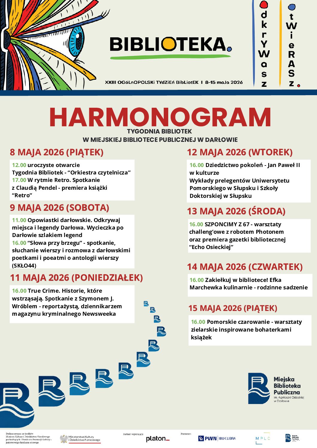 Miejska Biblioteka Publiczna im. Agnieszki Osieckiej w Darłowie zaprasza do wspólnego świętowania XXIII Ogólnopolskiego Tygodnia Bibliotek – czasu, w którym biblioteka staje się przestrzenią spotkań, odkryć i dobrej energii.