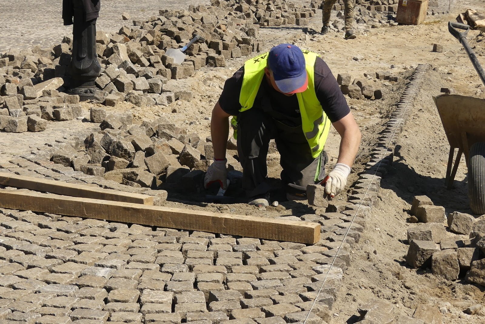 Nowa nawierzchnia na całym targowisku jest wykonywana z kostki granitowej w układzie rzymskiego bruku. Dzięki realizowanym pracom już niedługo poprawi się komfort i bezpieczeństwo korzystających z targowiska mieszkańców i sprzedawców.