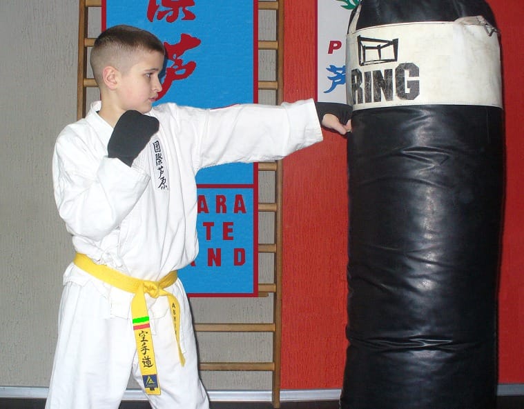 Młody chłopiec w karate gi trenuje na worku bokserskim