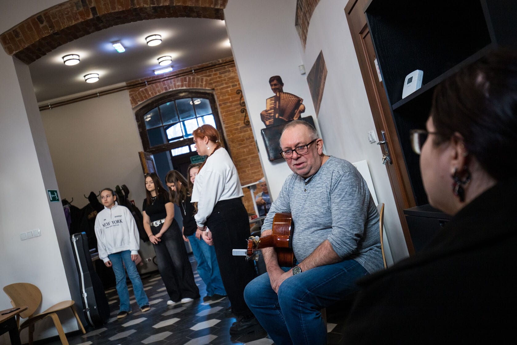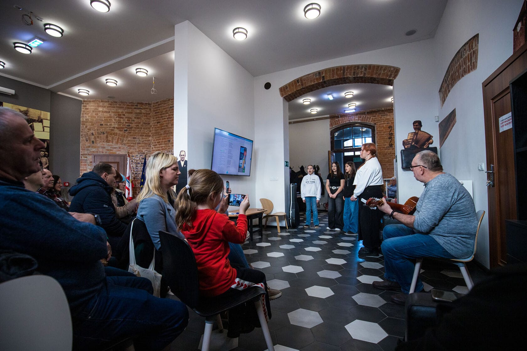 Ludzie słuchają prezentacji w historycznym wnętrzu