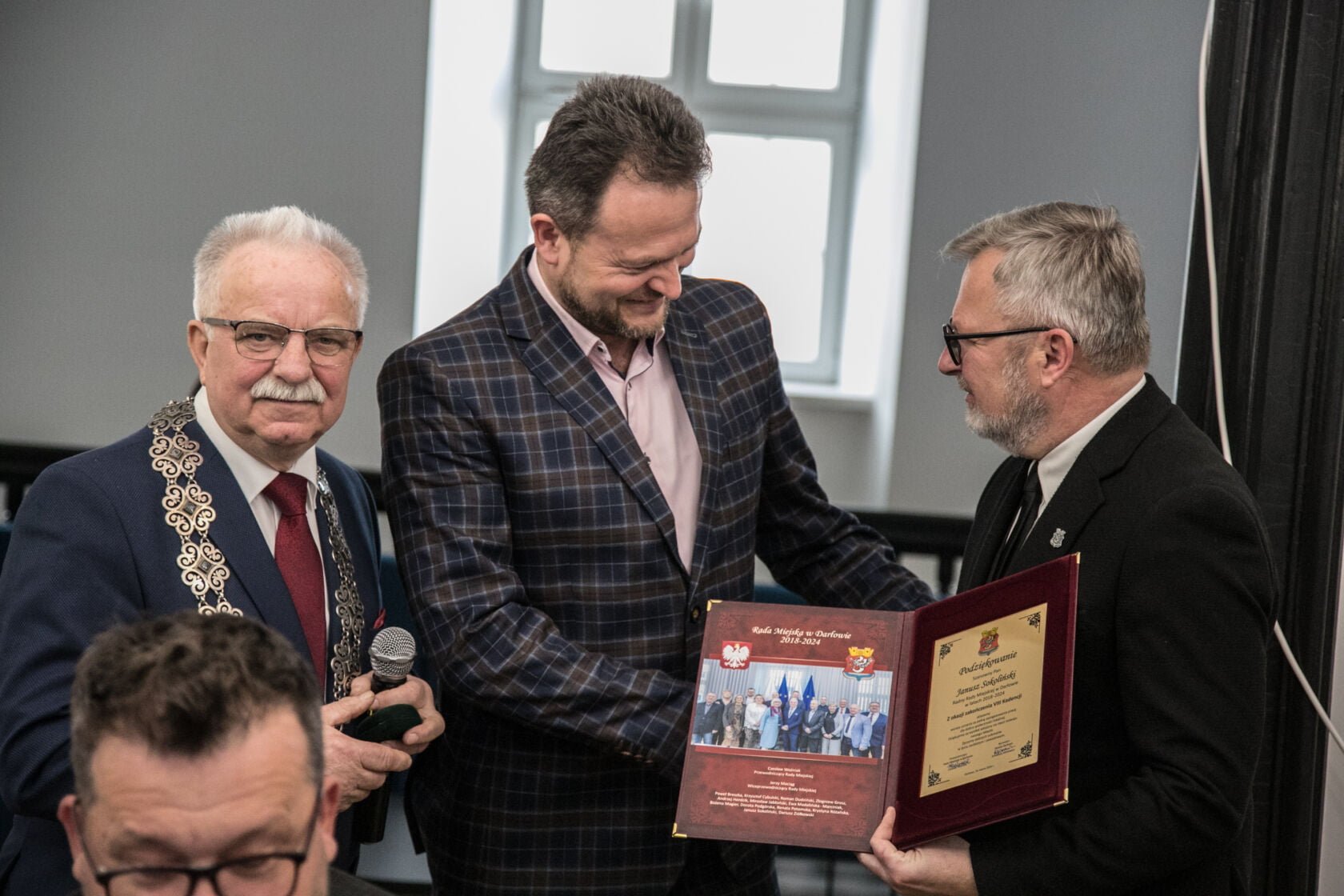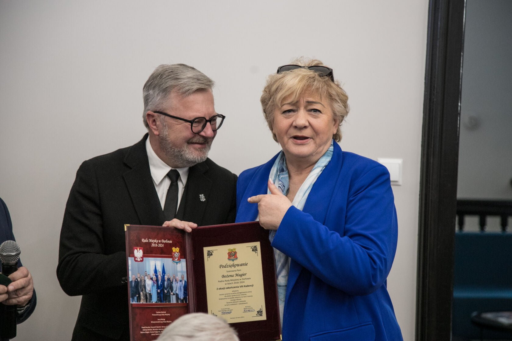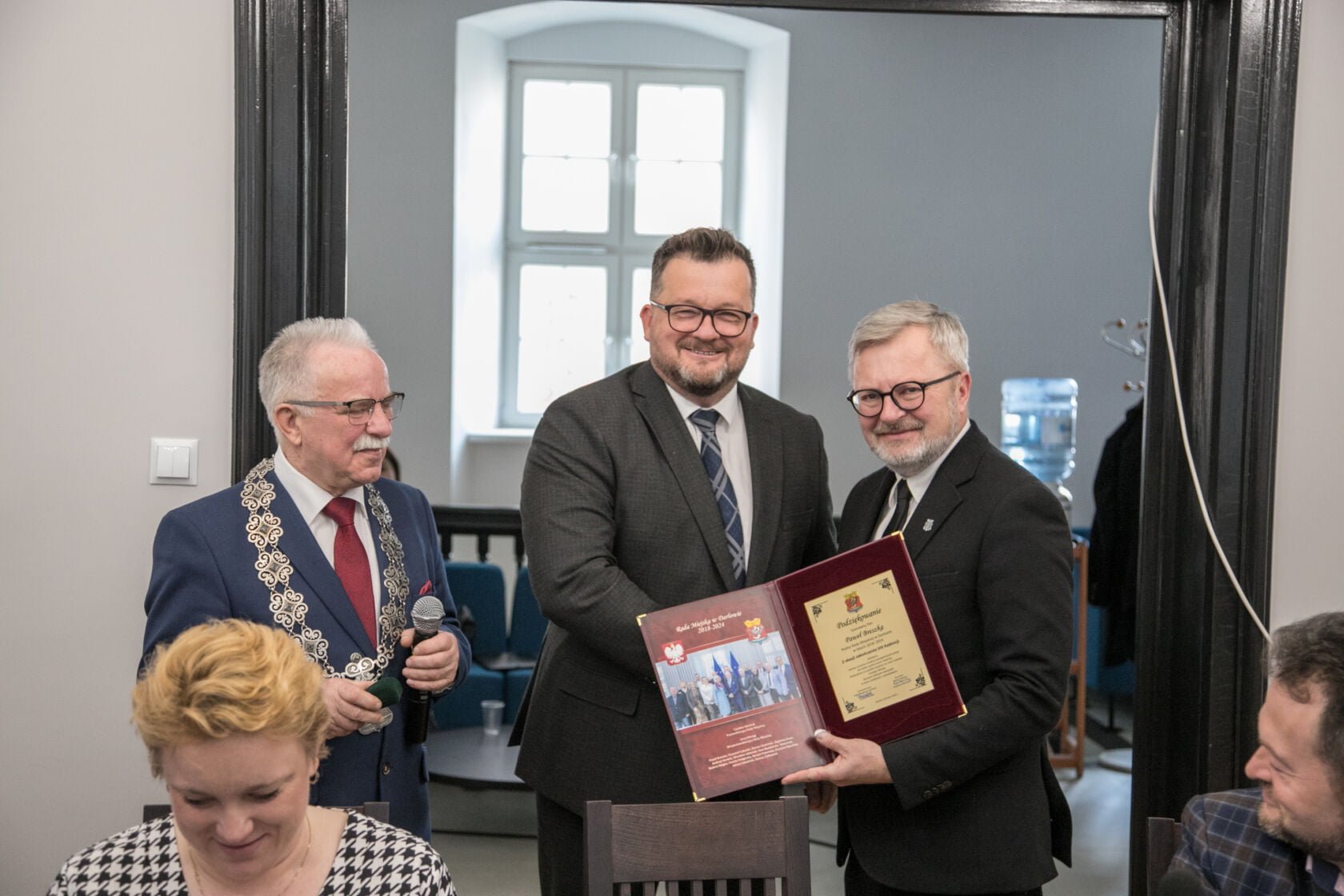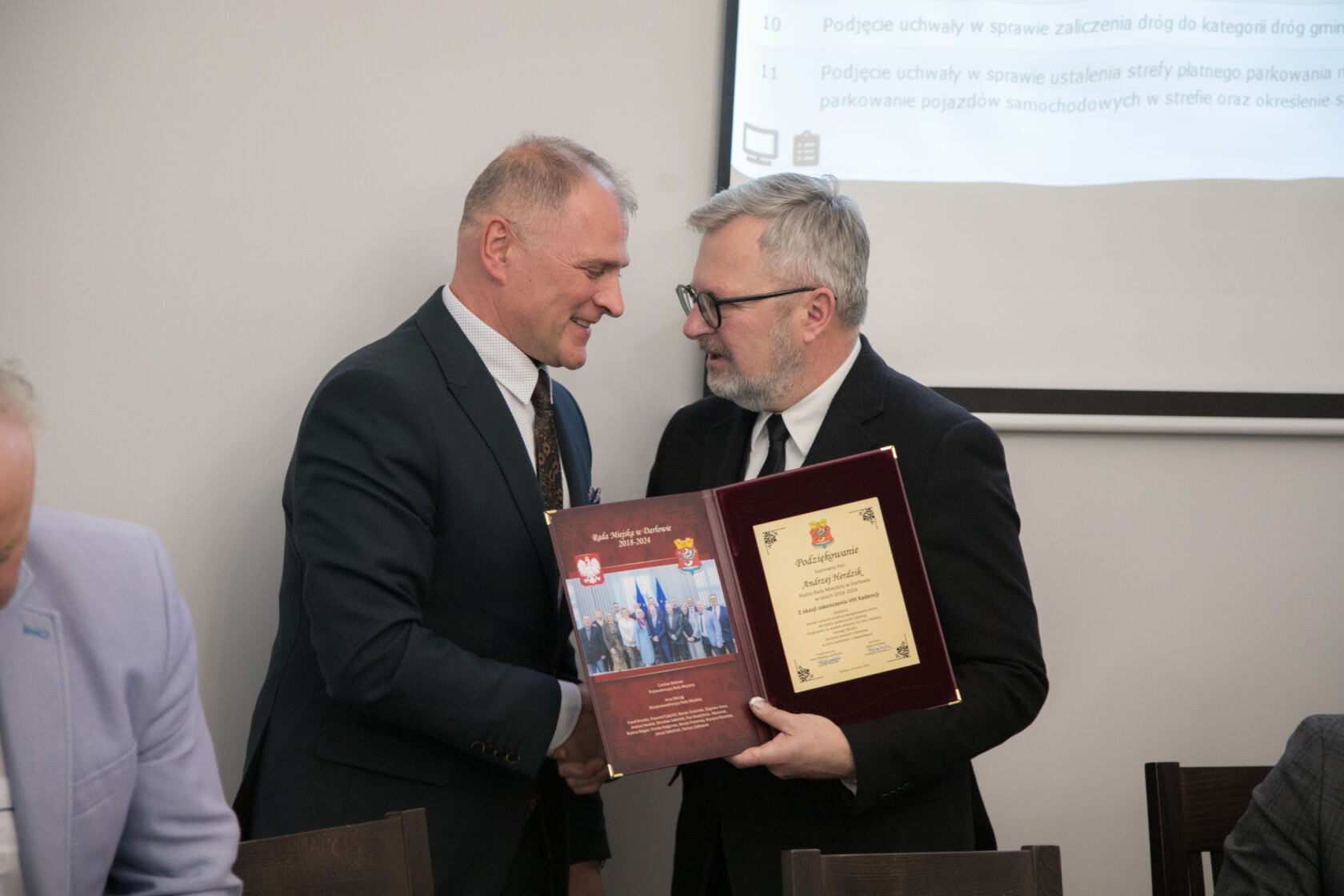 Podczas wtorkowej sesji był też czas na podsumowania i małą uroczystość. Każdy z radnych otrzymał z rąk burmistrza Miasta i przewodniczącego Rady Miejskiej pamiątkowe zdjęcie wraz z podziękowaniami za pracę w minionej kadencji. Podobne zdjęcie wraz z przypinką z herbem miasta powędrowało również w ręce burmistrza.