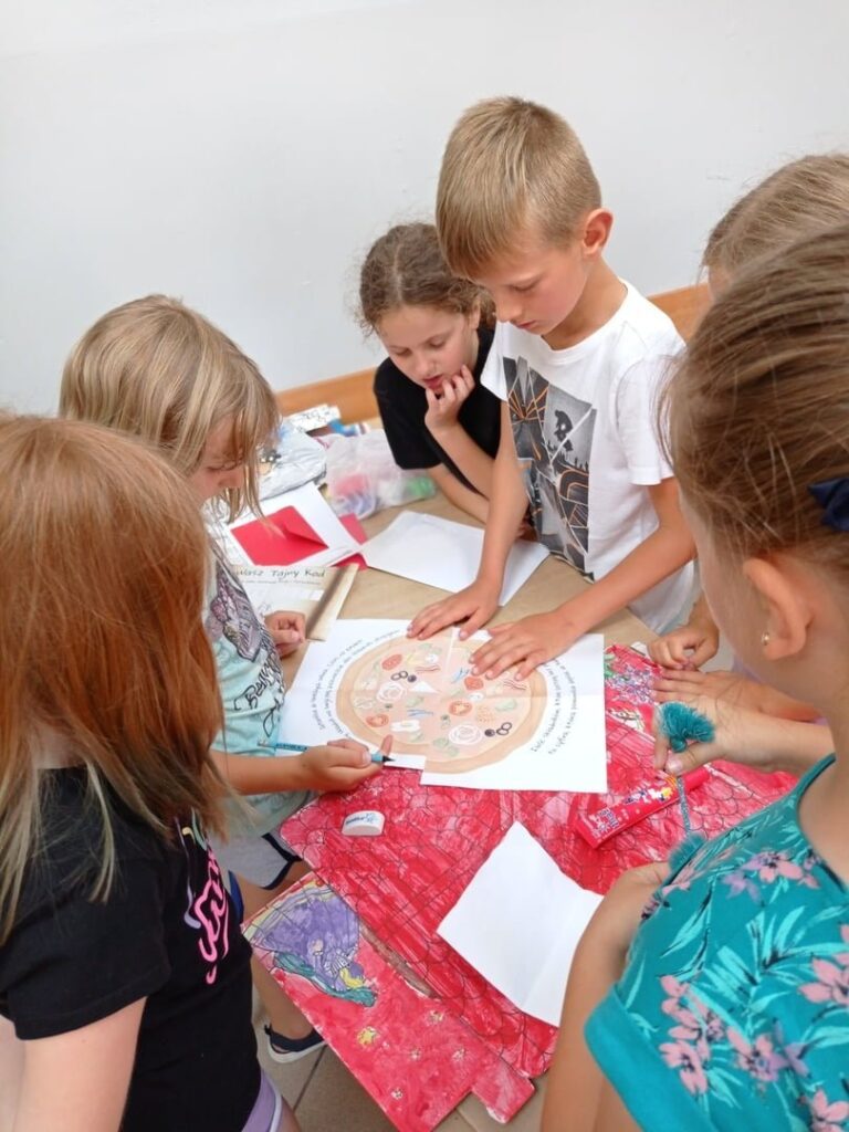 Na świetlicy dzieci również się nie nudziły. Brały czynny udział w zajęciach, od lekkich, integracyjnych, plastycznych po prawdziwie ambitne i artystyczne jak kolorowanie dużych figur przestrzennych i tworzenie ramek na zdjęcia z użyciem kolorowej gliny piankowej. Dzieci tworzyły również budowle ze słomek konstrukcyjnych i rurek magnetycznych. Dużym zainteresowaniem cieszyła się gra terenowa „W 1 Dzień dookoła świata” gdzie grupa podzielona na dwie drużyny miała za zadanie odnalezienie tajnego kodu. Gra ta miała na celu naukę współpracy przez zabawę. Podczas pobytu odbyły się także mistrzostwa półkolonii w Chińczyka i Cymbergaja.
