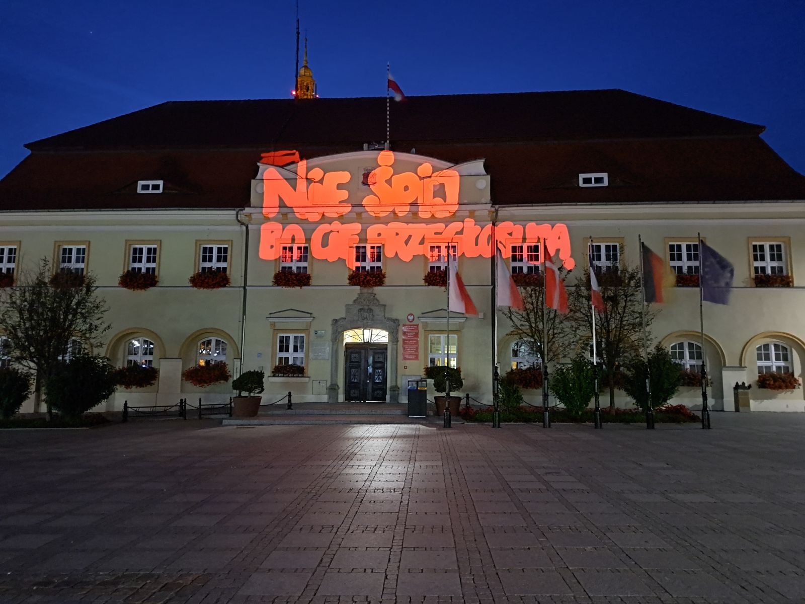 Miasto Darłowo przyłącza się do akcji profrekwencyjnej poprzez wyświetlenie hasła na frontowej ścianie ratusza w imię troski o demokrację.