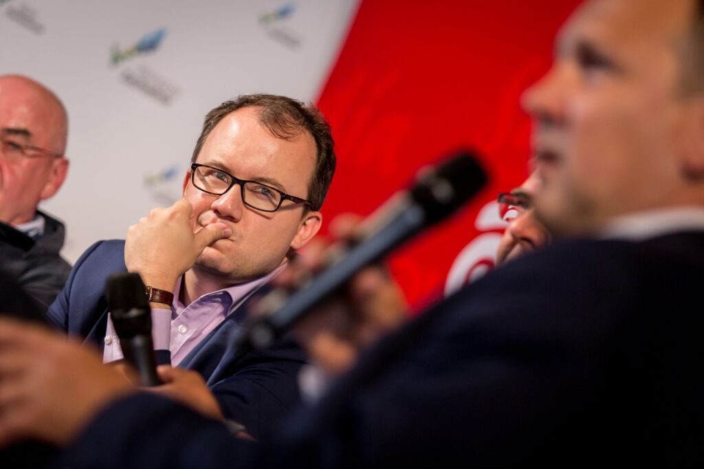 Mężczyzna w okularach mówi do mikrofonu, tło z logo