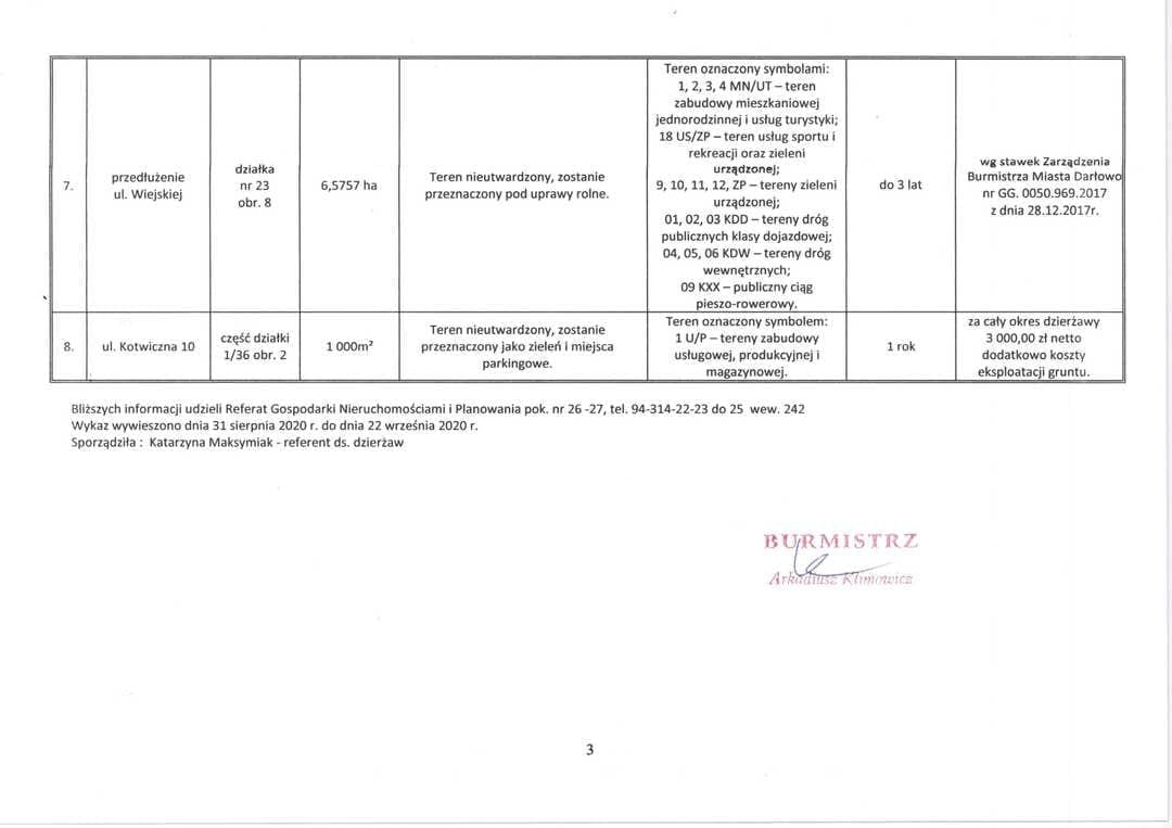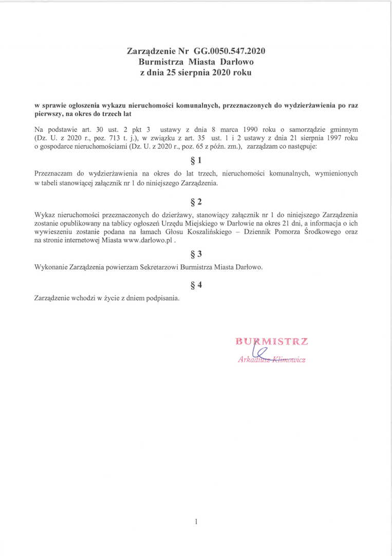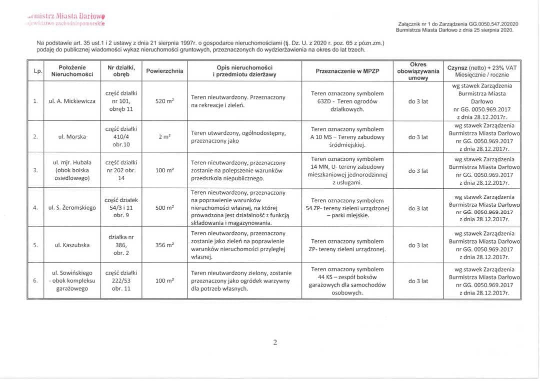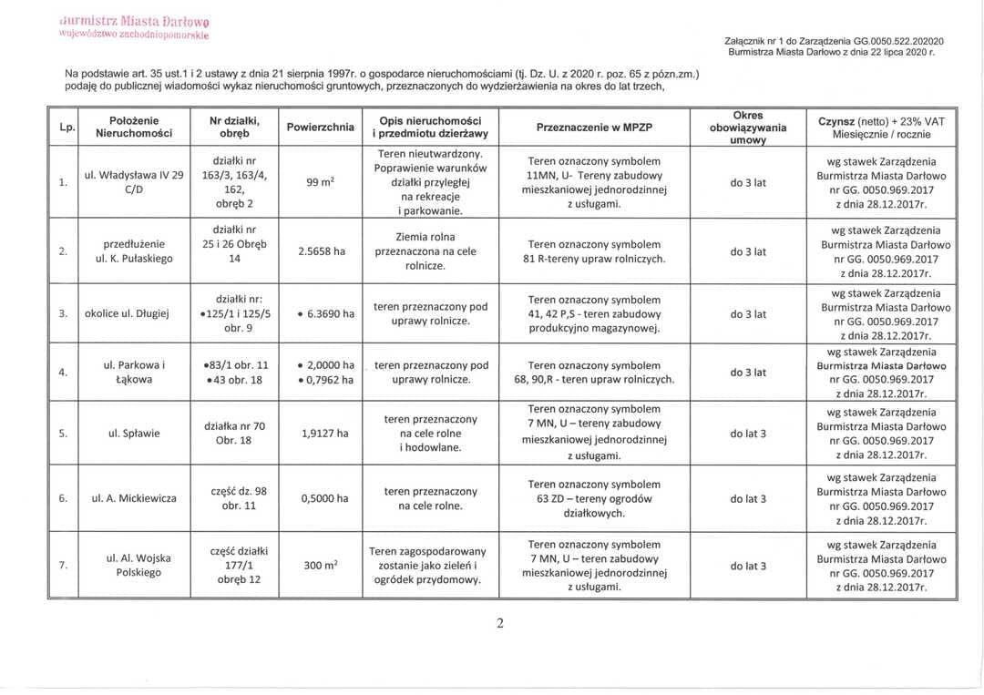 Zarządzenia Burmistrza Miasta Darłowo ws. dzierżaw i użyczenia