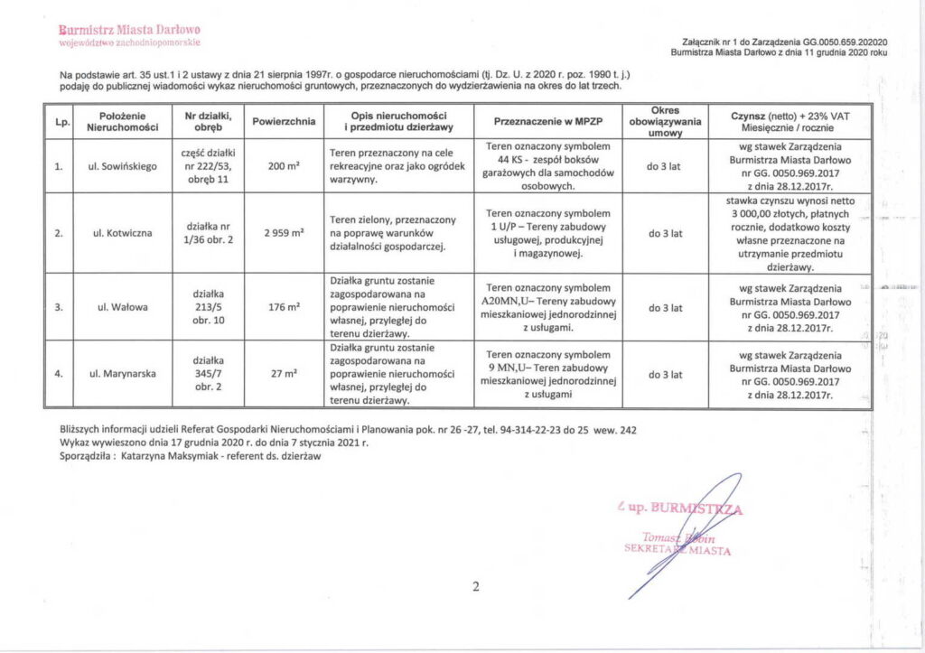 Zarządzenie Burmistrza Miasta Darłowo w sprawie ogłoszenia wykazu nieruchomości komunalnych, przeznaczonych do wydzierżawienia po raz pierwszy, na okres do trzech lat