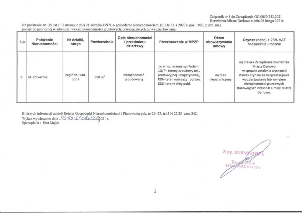 Zarządzenie Burmistrza Miasta Darłowo w sprawie wyrażenia zgody na zawarcie umowy dzierżawy na czas nieokreślony nieruchomości stanowiącej własność Gminy Miasta Darłowo